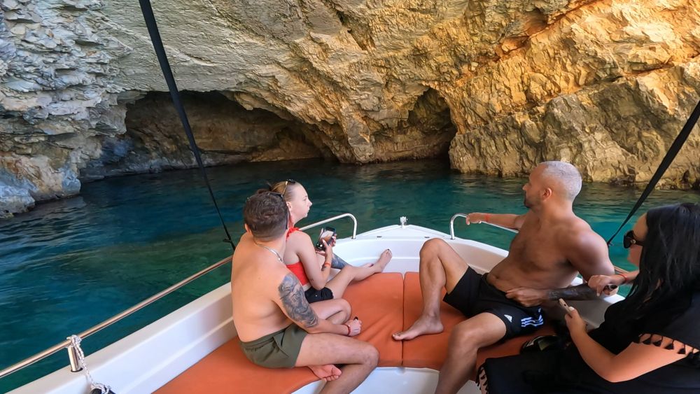Experience the freedom of exploring Zakynthos at your own pace with our self-drive boat rentals—no license required. Cruise through the stunning south coast, from the impressive Keri Caves to the crystal-clear waters of Turtle Island and the famous Mizithres Rocks.